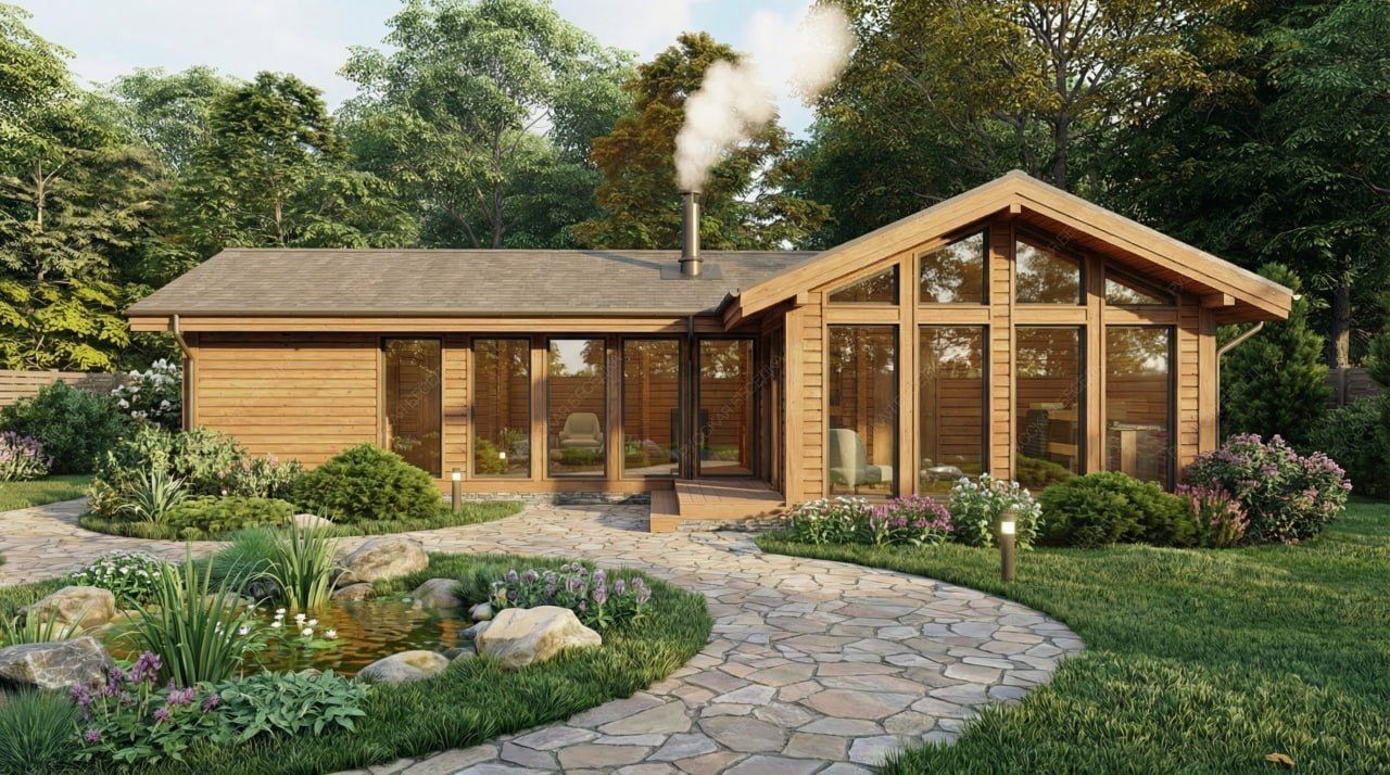 Двухскатная крыша придает строению солидный, завершенный облик и обеспечивает надежную защиту от осадков. Каркасная технология гарантирует высокую скорость возведения, энергоэффективность и долговечность конструкции. Данный проект ориентирован на создание многофункционального комплекса, где традиционные банные процедуры гармонично сочетаются с возможностями для полноценного загородного отдыха и гостеприимства.