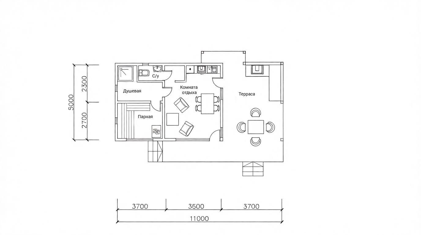 Каркасная баня «Сплав» размером 5х11 метров предлагает исключительно рациональную и просторную планировку общей площадью 55 кв.м. Ее архитектура с односкатной крышей отличается современным и лаконичным дизайном. Ключевой особенностью модели является интегрированная терраса, которая существенно расширяет полезное пространство для отдыха на свежем воздухе, плавно продолжая интерьер. Внутренняя компоновка продумана для максимального комфорта: просторная парная, функциональная душевая и отдельное помещение санузла. Центральное место занимает большая комната отдыха, способная стать полноценной гостевой зоной. Такая свободная планировка позволяет адаптировать пространство под индивидуальные потребности. Каркасная технология обеспечивает оперативную сборку и высокую энергоэффективность конструкции. Данный проект идеален для тех, кто ищет не просто баню, а многофункциональное место для отдыха большой компанией, где можно совмещать традиционные процедуры с приятным времяпрепровождением в любую погоду.