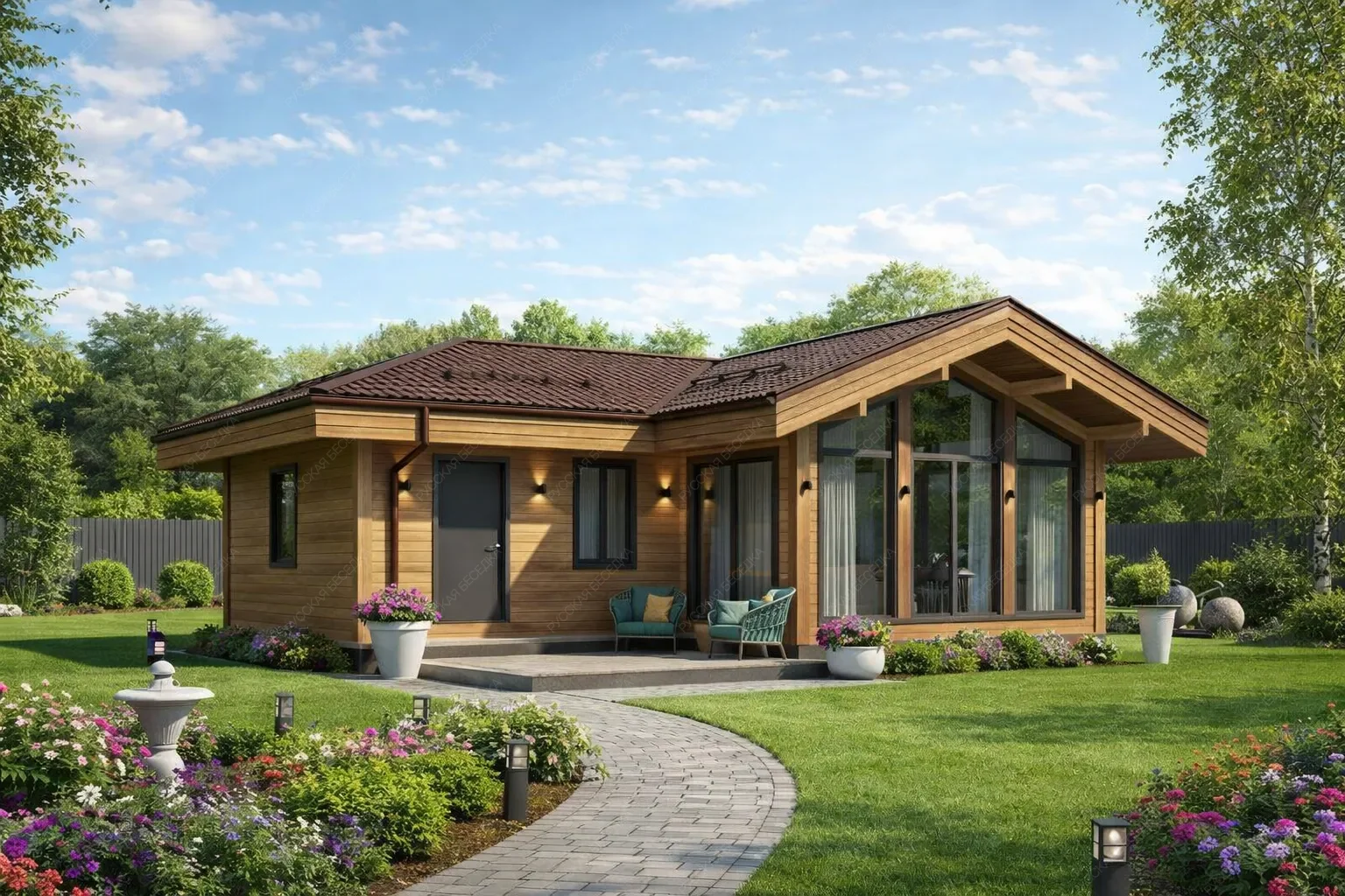 Каркасная баня «Воля» с габаритами 6х10 метров предлагает значительное пространство общей площадью 60 кв.м. под выразительной многоскатной крышей, формирующей запоминающийся архитектурный облик. Ключевой акцент в проекте сделан на интеграции интерьера с внешней средой. Зона отдыха оснащена панорамными окнами, которые наполняют помещение естественным светом и обеспечивают визуальный контакт с природой, создавая эффект единения с окружающим ландшафтом. Внутренняя планировка отличается продуманной эргономикой и комфортом. Просторная парная, функциональная душевая и технические помещения органично сочетаются с большой комнатой для релаксации, становящейся центральным местом притяжения. Многоскатная кровля сложной формы не только повышает эстетику, но и способствует эффективному отводу осадков. Каркасная технология гарантирует быстрый монтаж и отличные теплоизоляционные характеристики всей конструкции. Данная модель идеально подходит для ценителей эстетики, свободы пространства и особой атмосферы, где традиционная баня становится частью живописного загородного отдыха.