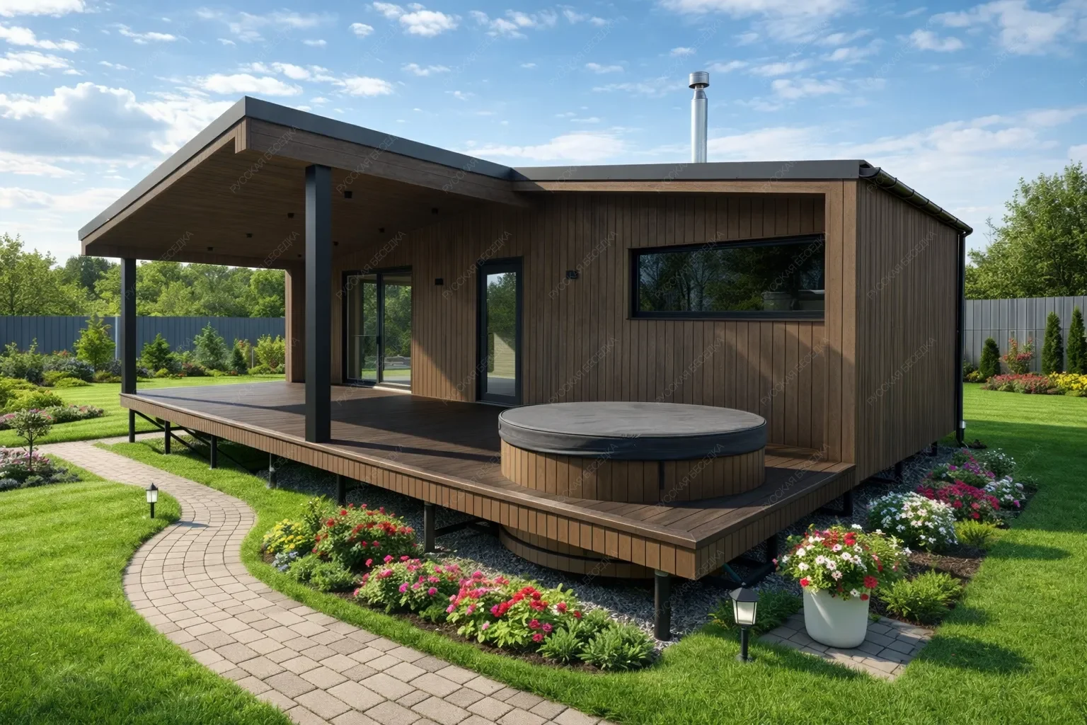 Баня «Взвар» размером 10х5 метров объединяет под двухскатной крышей функциональное пространство площадью 50 кв.м. и уникальную открытую террасу. Ключевой особенностью проекта является интегрированная в зону отдыха на свежем воздухе стационарная купель, что создает идеальную среду для контрастных водных процедур сразу после парной. Такое решение формирует целостный спа-комплекс на собственном участке. Каркасная технология обеспечивает оперативное строительство и эффективное энергосбережение. Внутренняя планировка продумана для комфортного последовательного ритуала: от парной и душевой — к просторной комнате отдыха с выходом на террасу. Двухскатная крыша придает строению классический, завершенный вид и надежность. Данная модель предлагает редкое сочетание аутентичности банных традиций с современным подходом к wellness-отдыху, где каждый элемент направлен на глубокое расслабление и восстановление сил в любое время года.