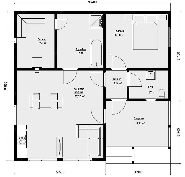 Каркасная баня «Хэлли» с габаритами 9,4х9 метров и выразительной многоскатной крышей представляет собой архитектурно сложный и функционально насыщенный проект площадью 84 кв.м. Многоскатная кровля не только формирует запоминающийся силуэт, но и обеспечивает оптимальное распределение снеговых и ветровых нагрузок, подчеркивая статусный характер строения. Внутреннее пространство организовано по принципу полноценного гостевого дома. Панорамное остекление наполняет комнату отдыха площадью 27,5 кв.м. естественным светом, визуально объединяя интерьер с окружающим ландшафтом. Отдельная спальня 12,3 кв.м. превращает баню в объект для продолжительного проживания и комфортного ночлега. Продуманная планировка включает просторную душевую 9 кв.м., парную 7,5 кв.м., санузел и тамбур, обеспечивающий тепловой буфер. Терраса 10,3 кв.м. служит естественным продолжением гостиной зоны. Каркасная технология гарантирует оперативное возведение и высокие теплоизоляционные характеристики при значительной площади строения. Данный проект предназначен для создания многофункционального семейного комплекса, где традиционная баня дополнена возможностями загородной резиденции с акцентом на светлую архитектуру и панорамные виды.
