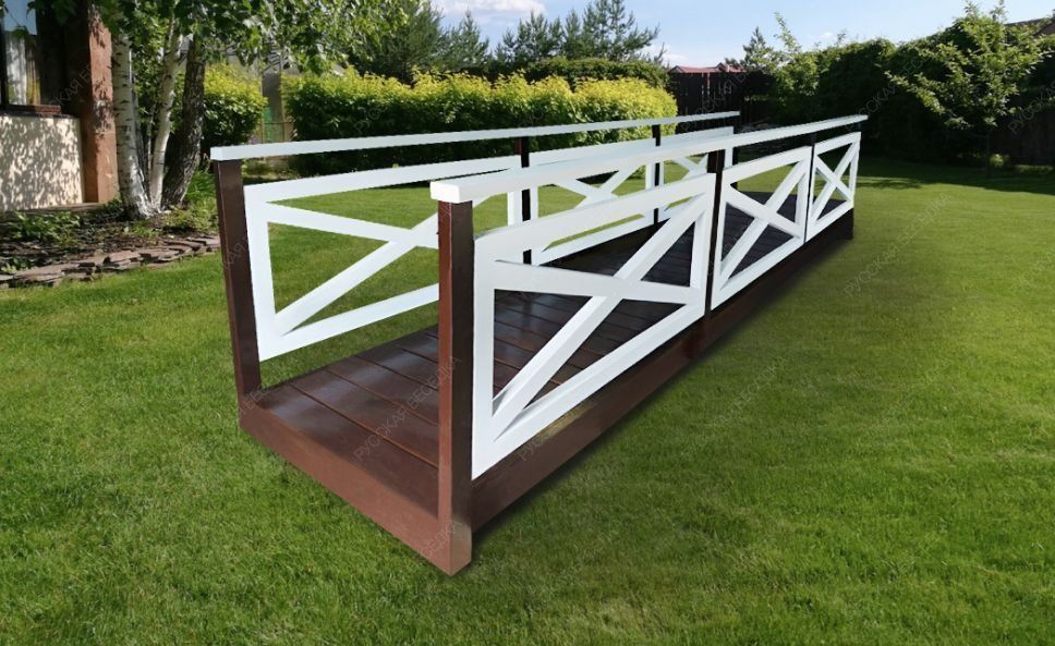Большой деревянный мост служит реальной переправой через не широкую речку или в качестве соединения двух участков с целью перемещения с одной части на другую. Мост выглядит стильно и привлекательно, вписывается в любые дизайнерские замыслы, может быть настоящим достоянием места, где его поставят. Деревянный мост шириной 1,0 м. позволяет ходить по нему максимально комфортно, перила размещены на удобном расстоянии от земли.