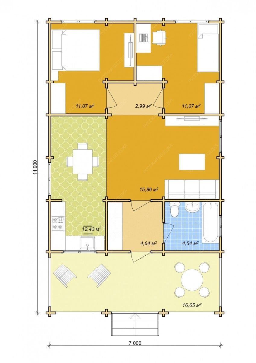 • Потолок: имитация бруса 20×135 мм., камерной сушки