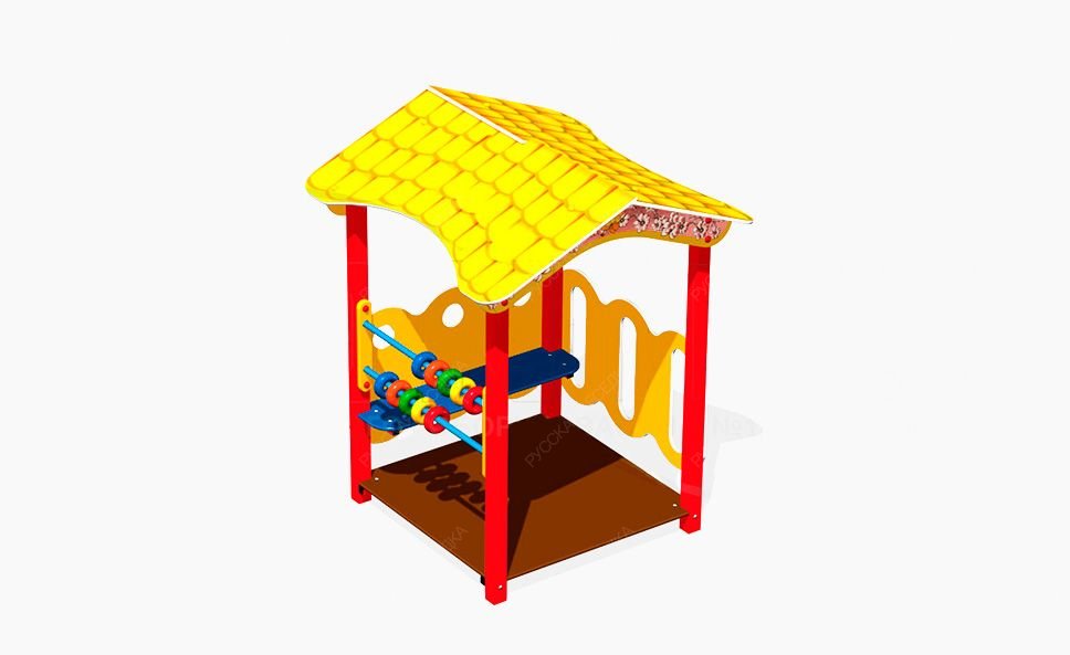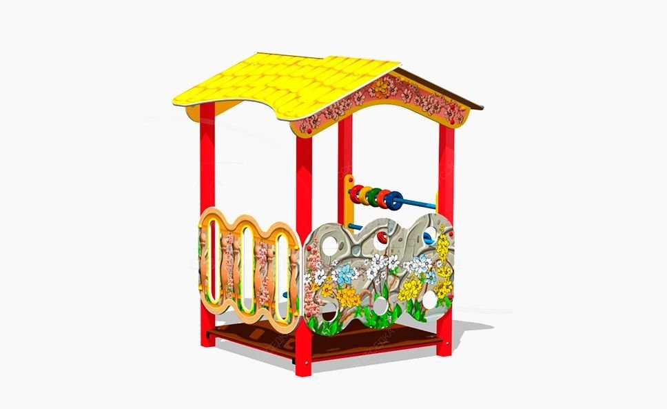Детский игровой домик «Беседка У1» — это сборная конструкция, состоящая из дна, стоек, и красочно оформленных боковых стенок и крыши. Изображения накладкок этой модели игрового домика выполнены методом прямой ультрафиолетовой печати. Счеты изготовлены из пластика. Данный игровой домик предназначен для эксплуатации на уличных детских игровых площадках.          Фанерные детали предварительно обработаны антисептической выравнивающей грунтовкой. Каркас — полимерно-порошковая краска. Рисунок нанесен методом печати на УФ принтере по грунтовке и покрыт лаком. Покрытия устойчивы к сложным атмосферным условиям, истиранию, воздействию ультрафиолета.