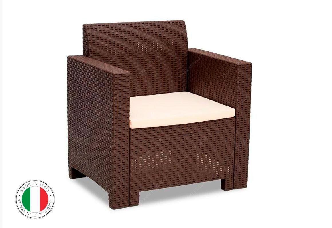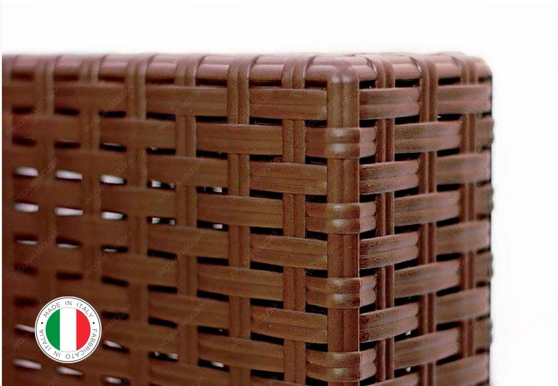 Пластиковый комплект порадует любителей плетеной мебели своей фактурой в стиле ротанг и прочностью: максимальная нагрузка на кресло до 160 кг. Мебель разработана итальянскими дизайнерами, что гарантирует современный стиль и высокое качество продукта.
