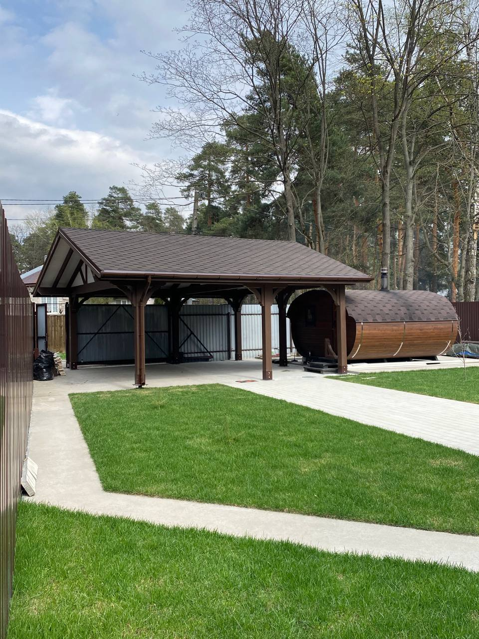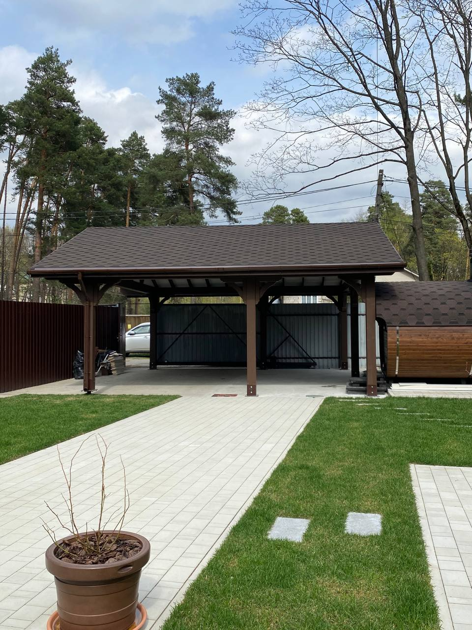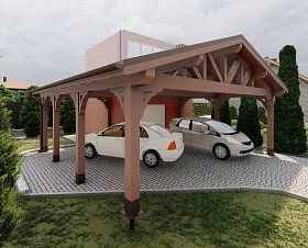 Навес из дерева послужит отличным парковочным местом для одного или нескольких автомобилей.
