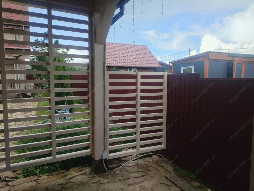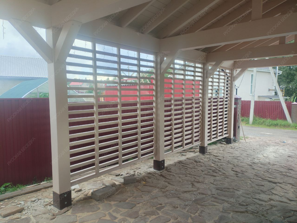 Для производства всех элементов навеса используется только отборная древесина без малейших дефектов, прошедшая камерную сушку и пропитку антисептиками. Навесу после защитной обработки лаком не страшны высокая влажность, а значит, можно быть уверенным, что дерево не растрескается, не разбухнет и не покоробится.