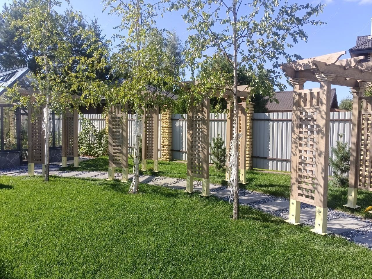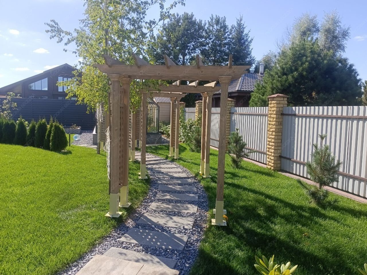 Деревянная пергола придаст вашему садовому участку теплую и уютную атмосферу.Также пергола может служить опорой для плетущихся растений - только представьте, как приятно находиться в окружении цветущего клематиса или пышных роз! Дополнительные элементы, такие как встроенное освещение, декоративные решетки, качели или скамейки, могут усилить визуальный эффект и создать еще более комфортное пространство. А если в конструкцию перголы добавить подиум, то он может служить местом для расслабления или стать сценой для семейных мероприятий.
