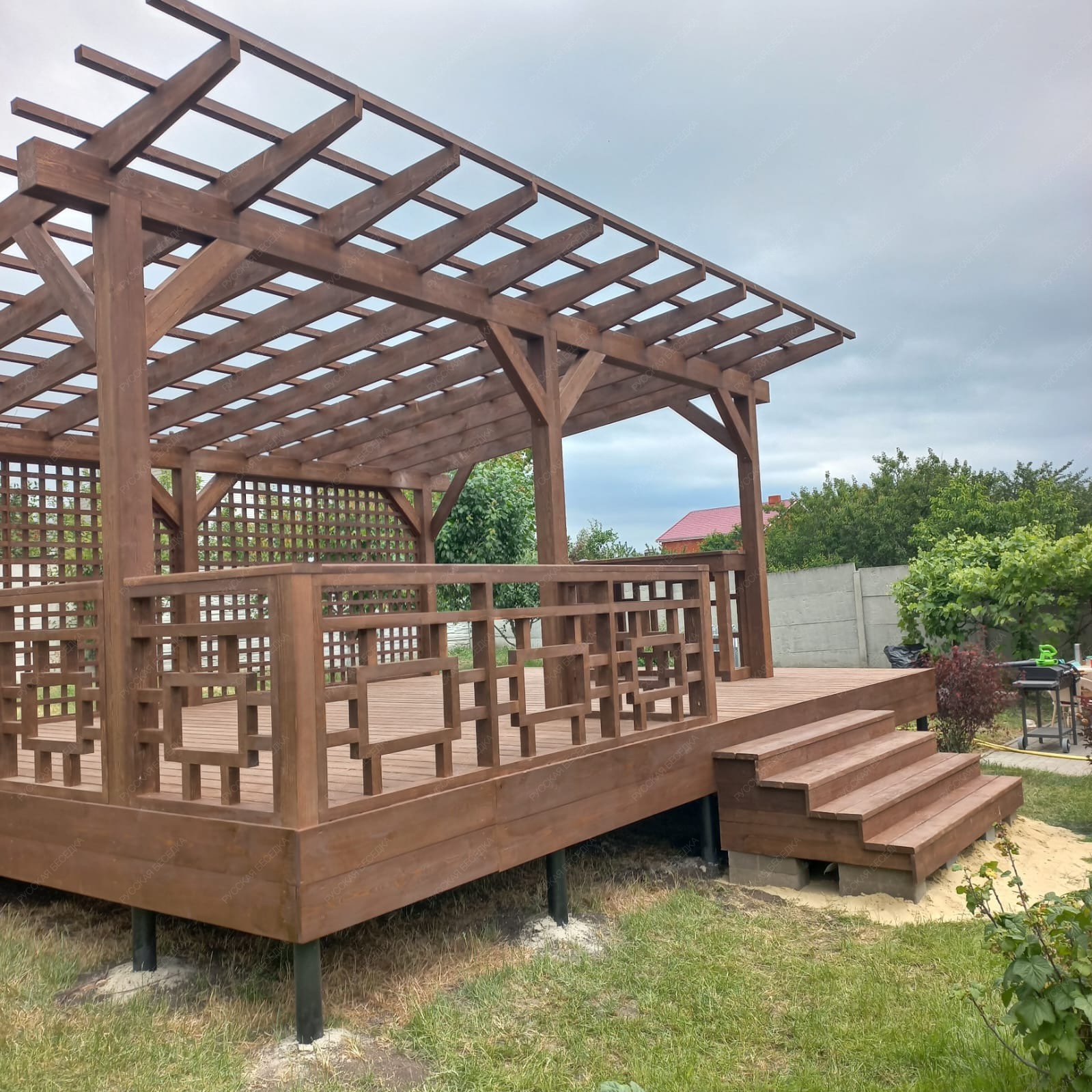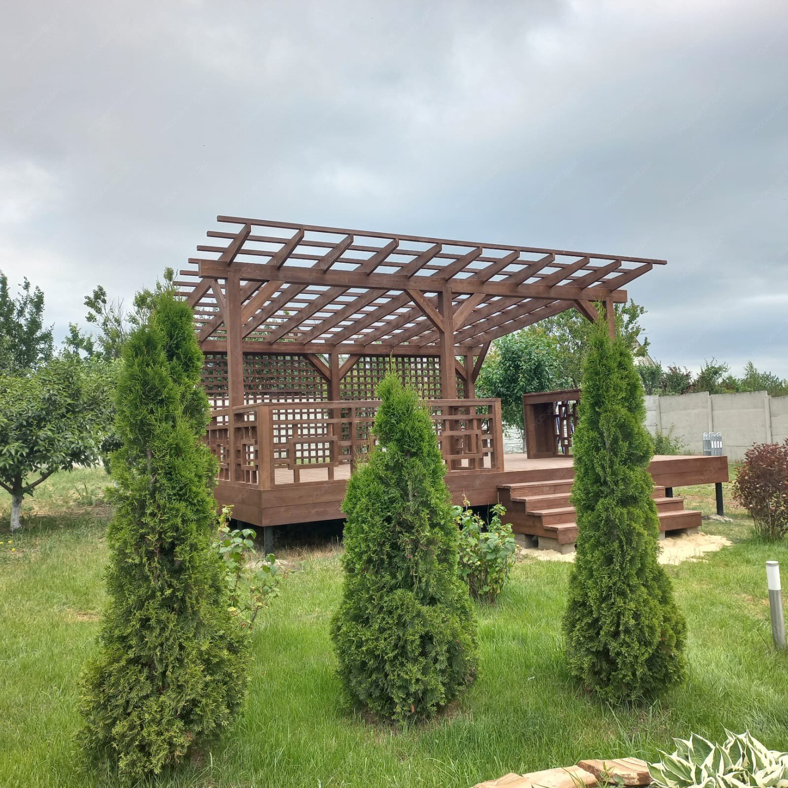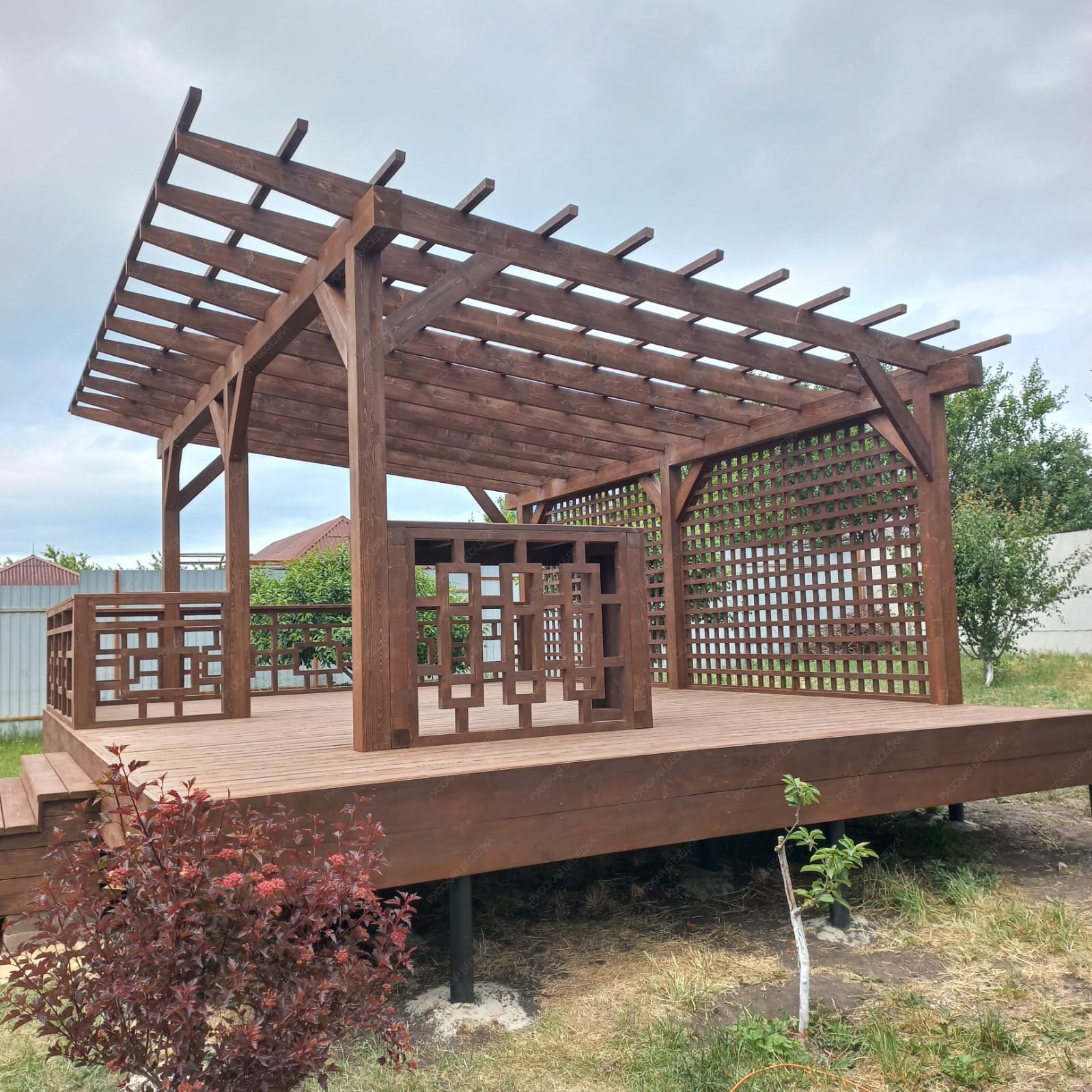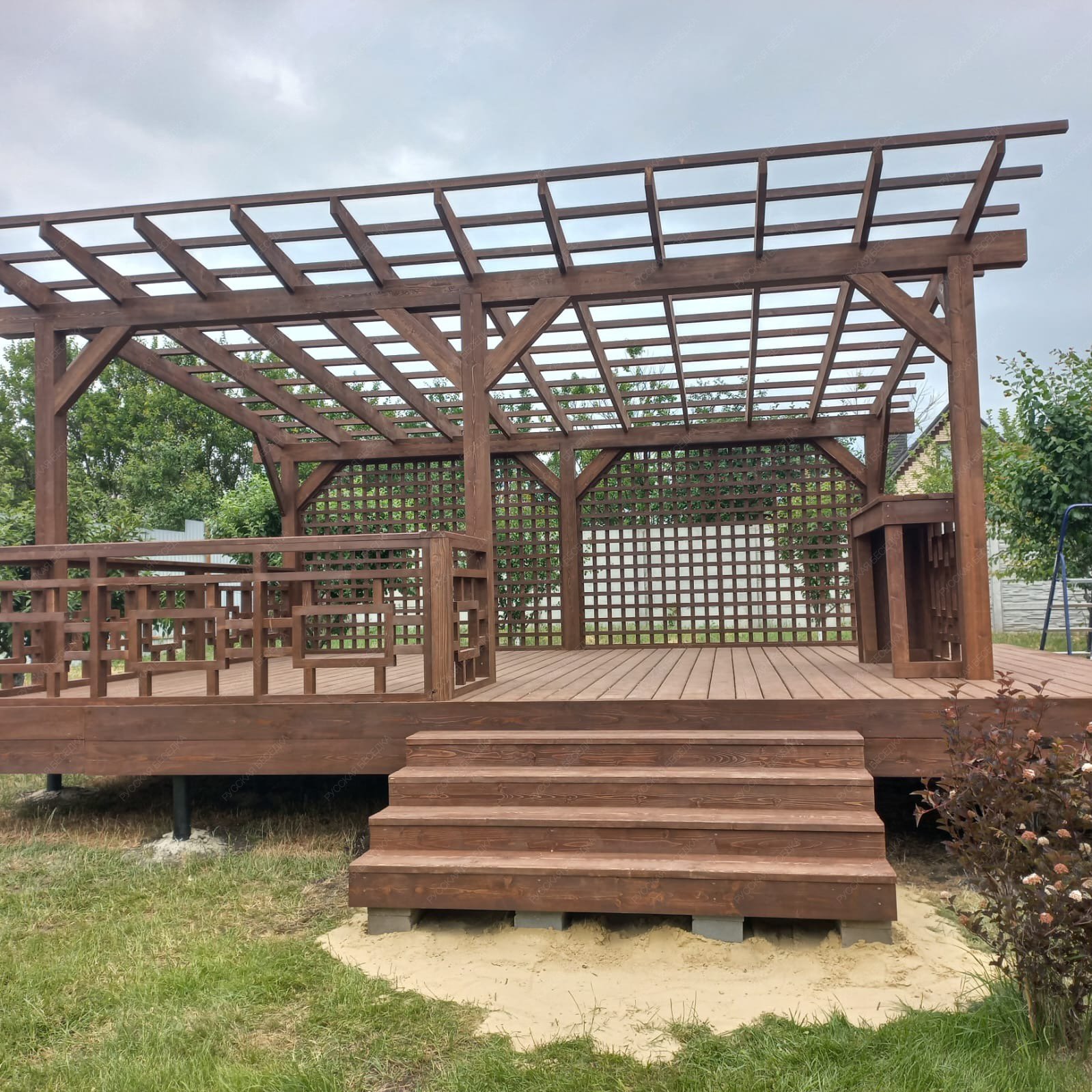 Деревянная пергола придаст вашему садовому участку теплую и уютную атмосферу.Также пергола может служить опорой для плетущихся растений - только представьте, как приятно находиться в окружении цветущего клематиса или пышных роз! Дополнительные элементы, такие как встроенное освещение, декоративные решетки, качели или скамейки, могут усилить визуальный эффект и создать еще более комфортное пространство. А если в конструкцию перголы добавить подиум, то он может служить местом для расслабления или стать сценой для семейных мероприятий.