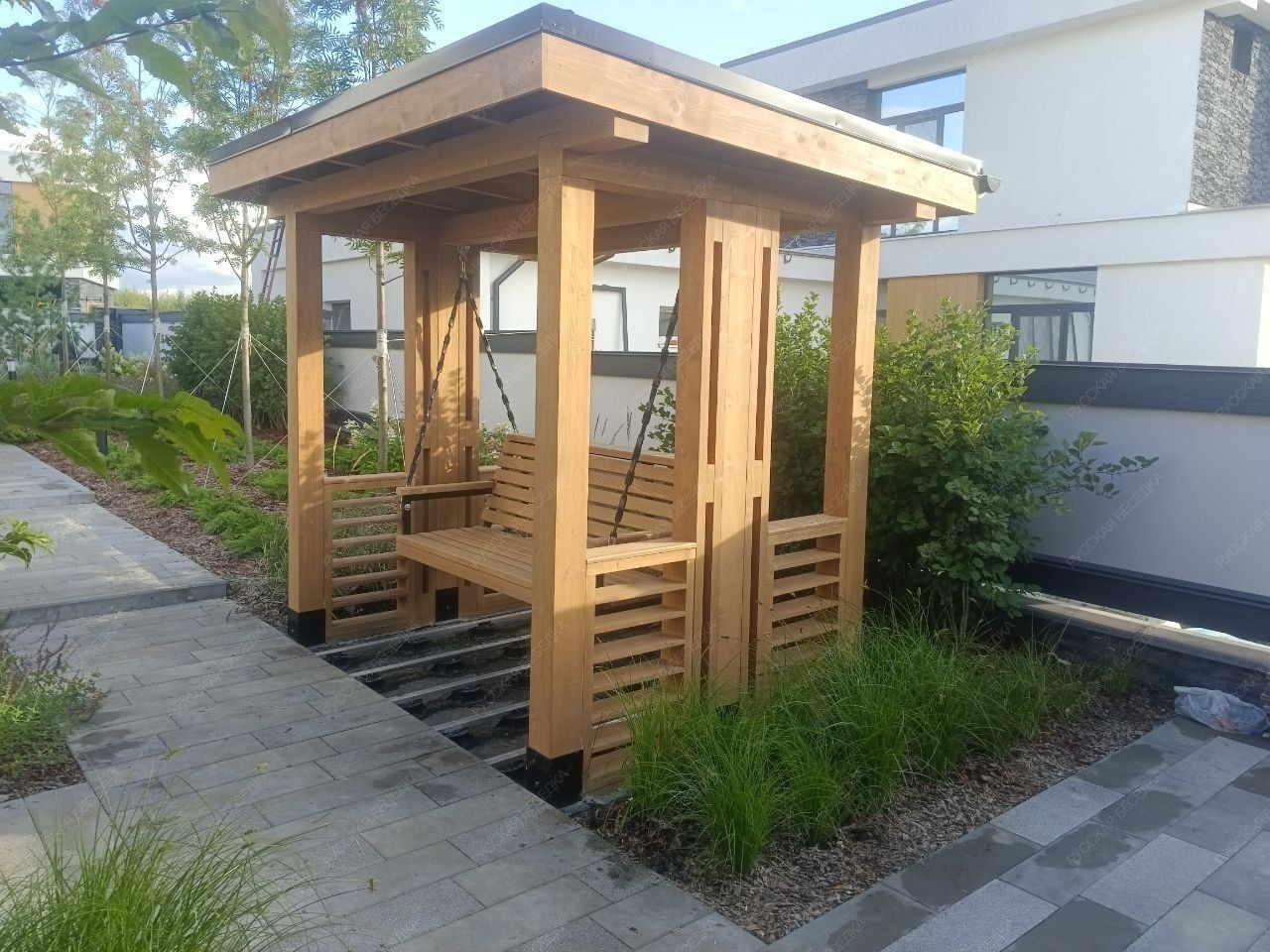 Деревянная пергола придаст вашему садовому участку теплую и уютную атмосферу.Также пергола может служить опорой для плетущихся растений - только представьте, как приятно находиться в окружении цветущего клематиса или пышных роз! Дополнительные элементы, такие как встроенное освещение, декоративные решетки, качели или скамейки, могут усилить визуальный эффект и создать еще более комфортное пространство. А если в конструкцию перголы добавить подиум, то он может служить местом для расслабления или стать сценой для семейных мероприятий.