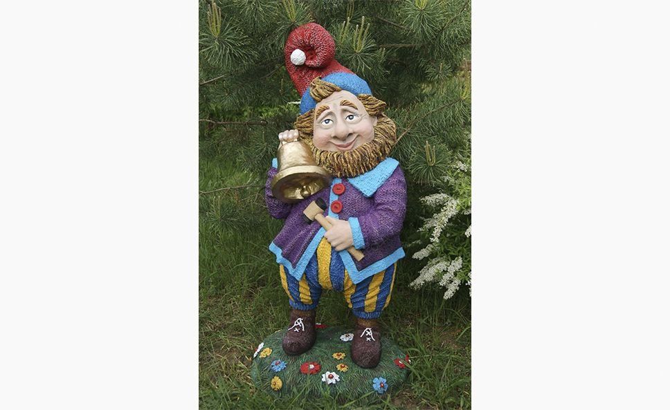 Фигура Гном с колокольчиком из стеклопластика повышенной прочности. Вес (кг): 17, Высота (см): 130, Ширина (см): 70, Глубина (см): 70 Данные садовые фигуры изготавливаются из стеклоткани и полиэфирной тиксотропной смолы. Это материалы высокого качества, аналогичные тем, из которого делают стеклопластиковые катера и яхты. Это не гипс (хрупкий и не влагостойкий), не полистоун (хрупкий и не ударопрочный) - наши фигуры ударопрочные и долговечные из стеклопластика. Для покрытия наших садовых украшений используются фирменные финские краски, нечувствительные к перепадам температур, выгоранию, воздействию влаги. Их не нужно укрывать от дождя, прятать от солнца или убирать в зимнее время - независимо от погодных условий они радуют глаз свежестью и яркостью, не требующей никакого ухода.