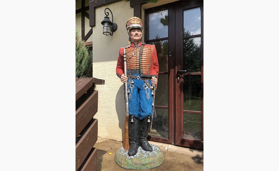 Дизайнерская фигура «Гусар в красном» прекрасно подойдёт всем любителям  этой эпохи и военной тематики. Садовая фигура добавит оригинальности и изящности, станет изюминкой вашего ландшафта. Фигурка из прочного, лёгкого стеклопластика, противоударная и влагостойкая, не боится изменения температуры, сохранит на долгие годы первозданный вид.