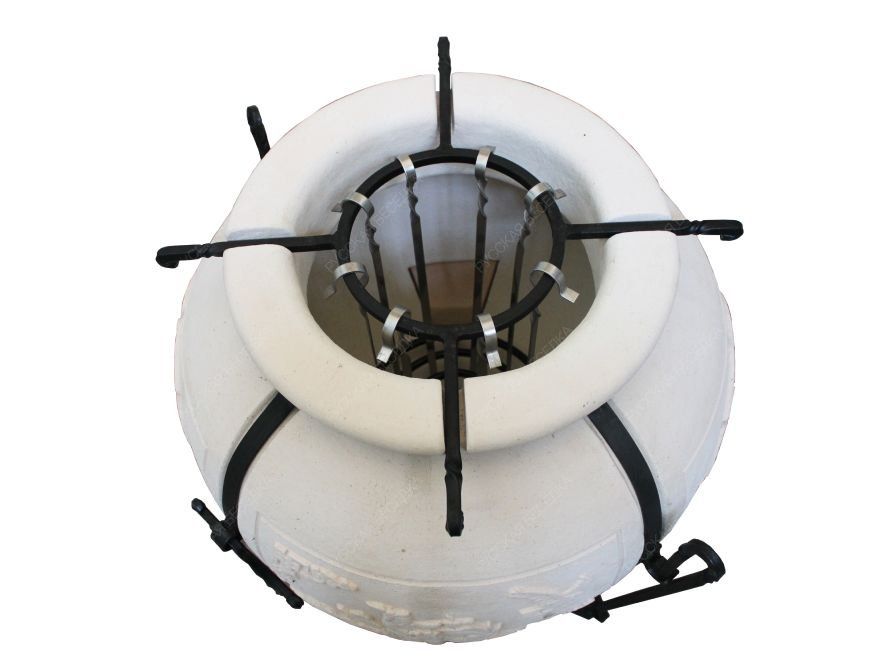 Тандыр для максимальной надежности обтянут в металлический каркас, при изготовлении которого используются гнутье и элементы ковки.